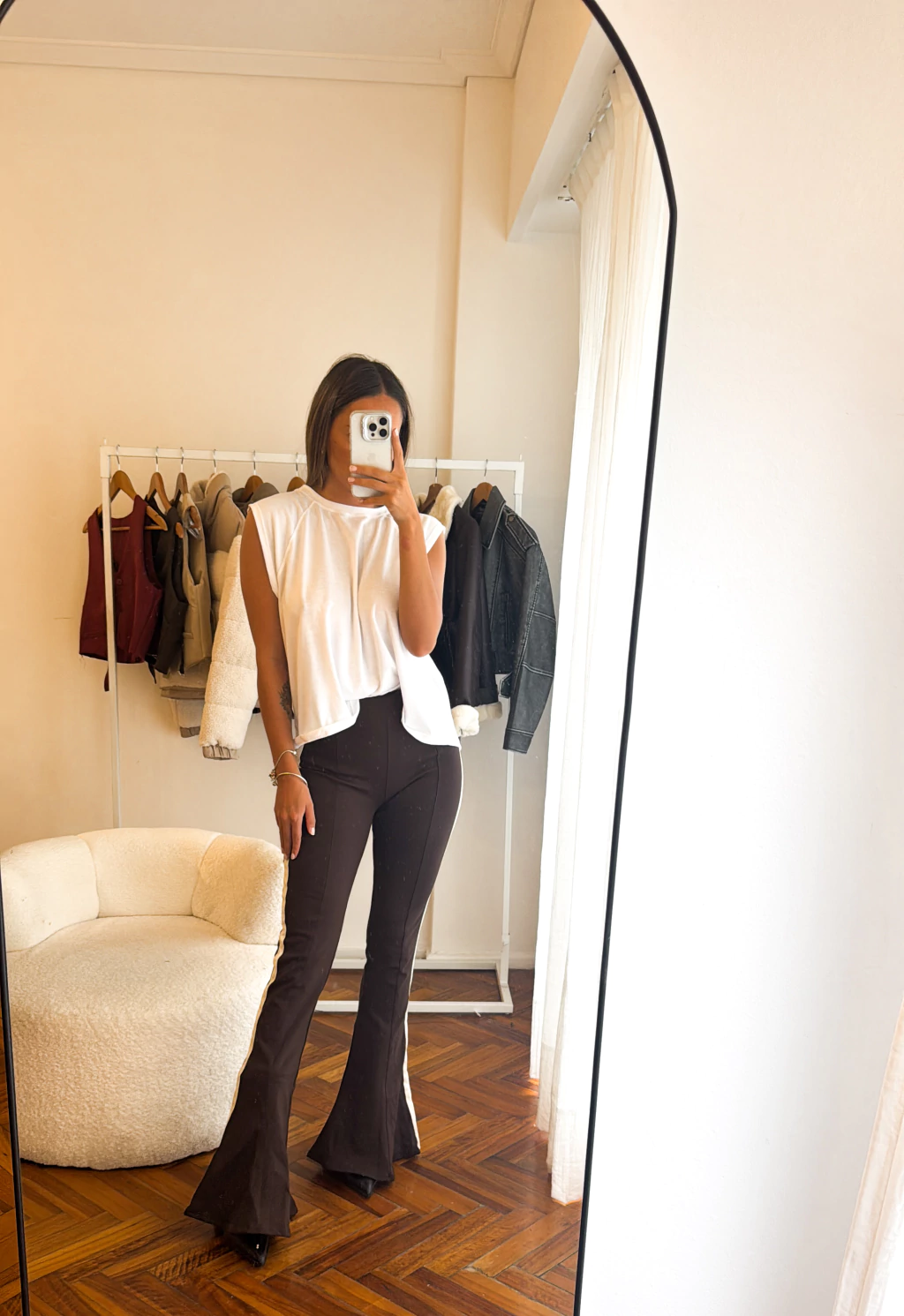Pantalón de punto roma, de corte oxford con recorte central pespunteado, con cinta color crudo en laterales y cierre invisible en cintura