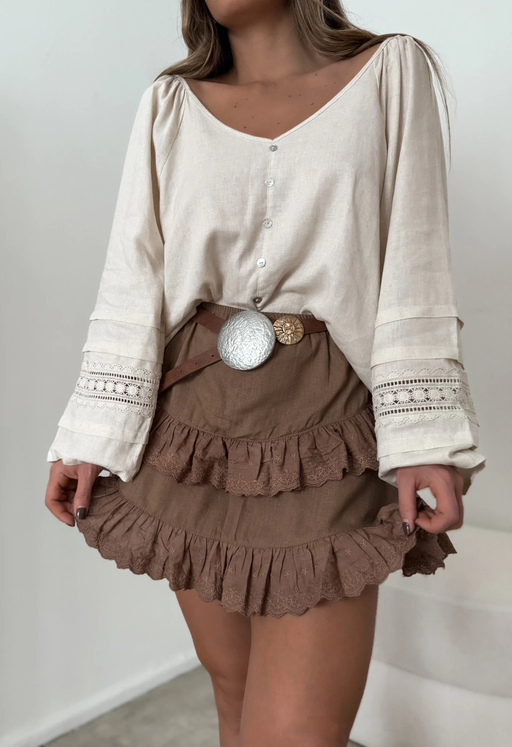 Camisa de lino con guardas de broderie y elásticos en manga es delicadisima y amplia
