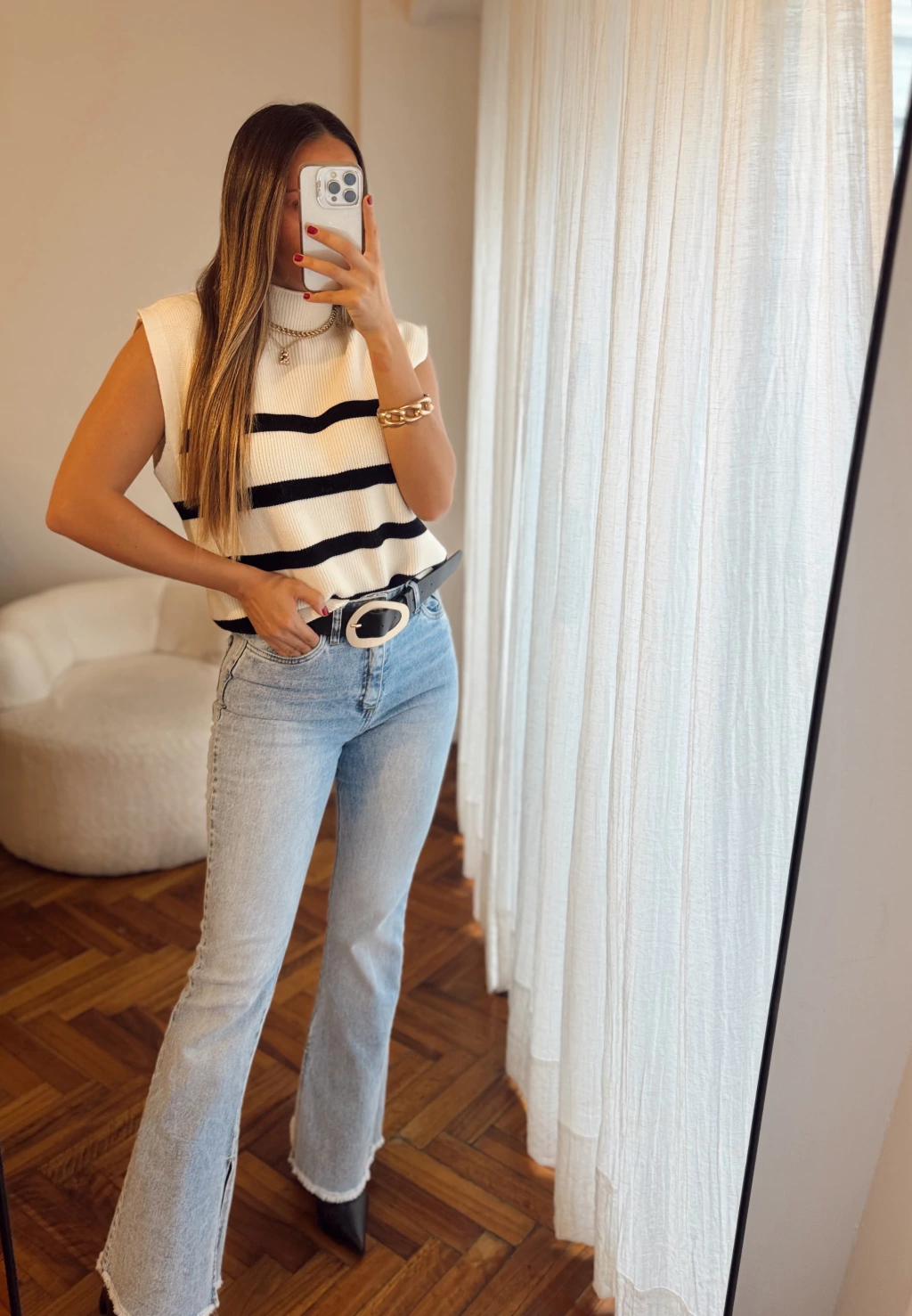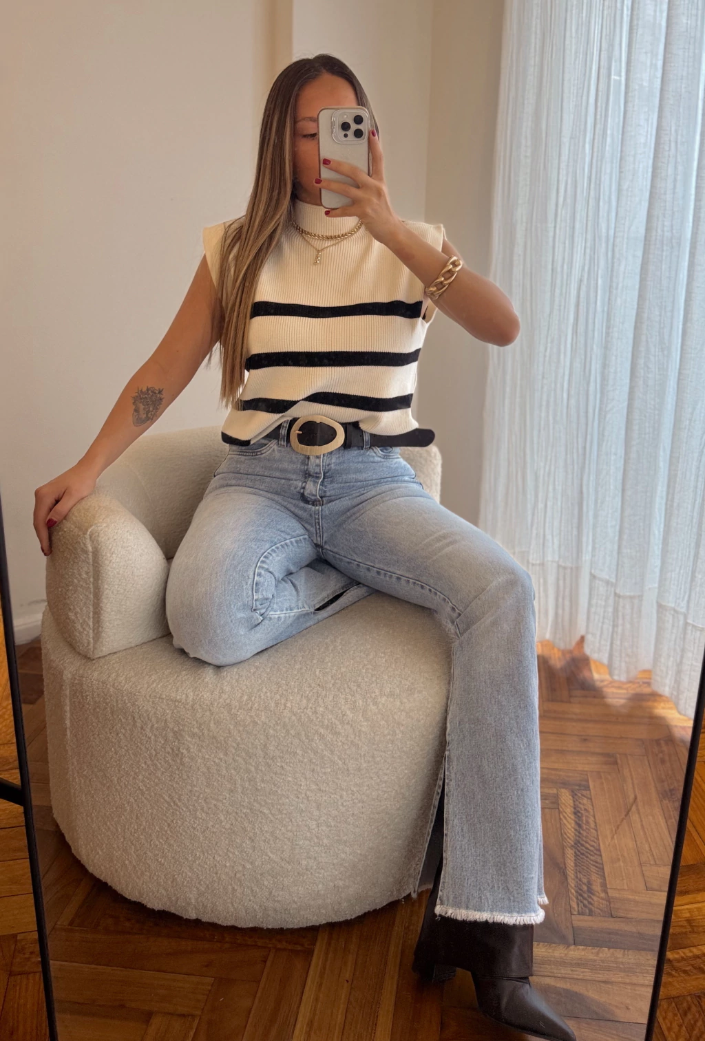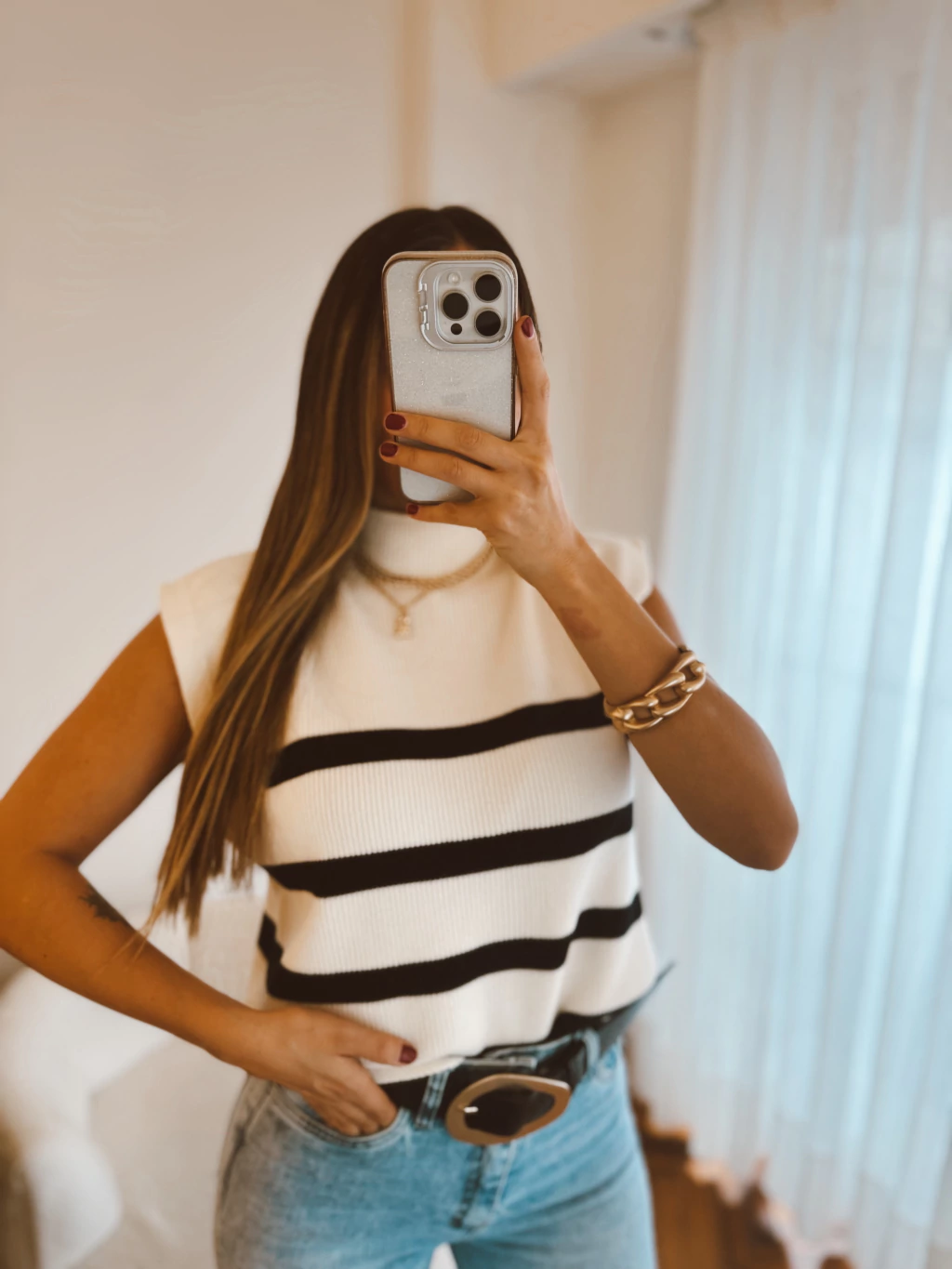 Chaleco tejido en punto ingles, rayado, con escote media polera y punto ribb en el ruedo.