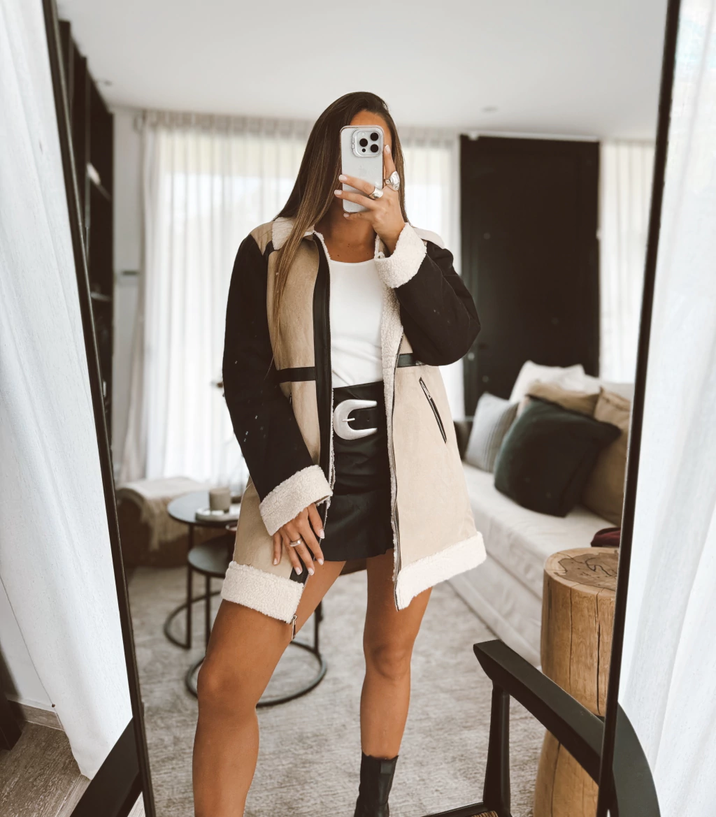 Tapado gamulan largo combinado con boucle y ribetes cuero