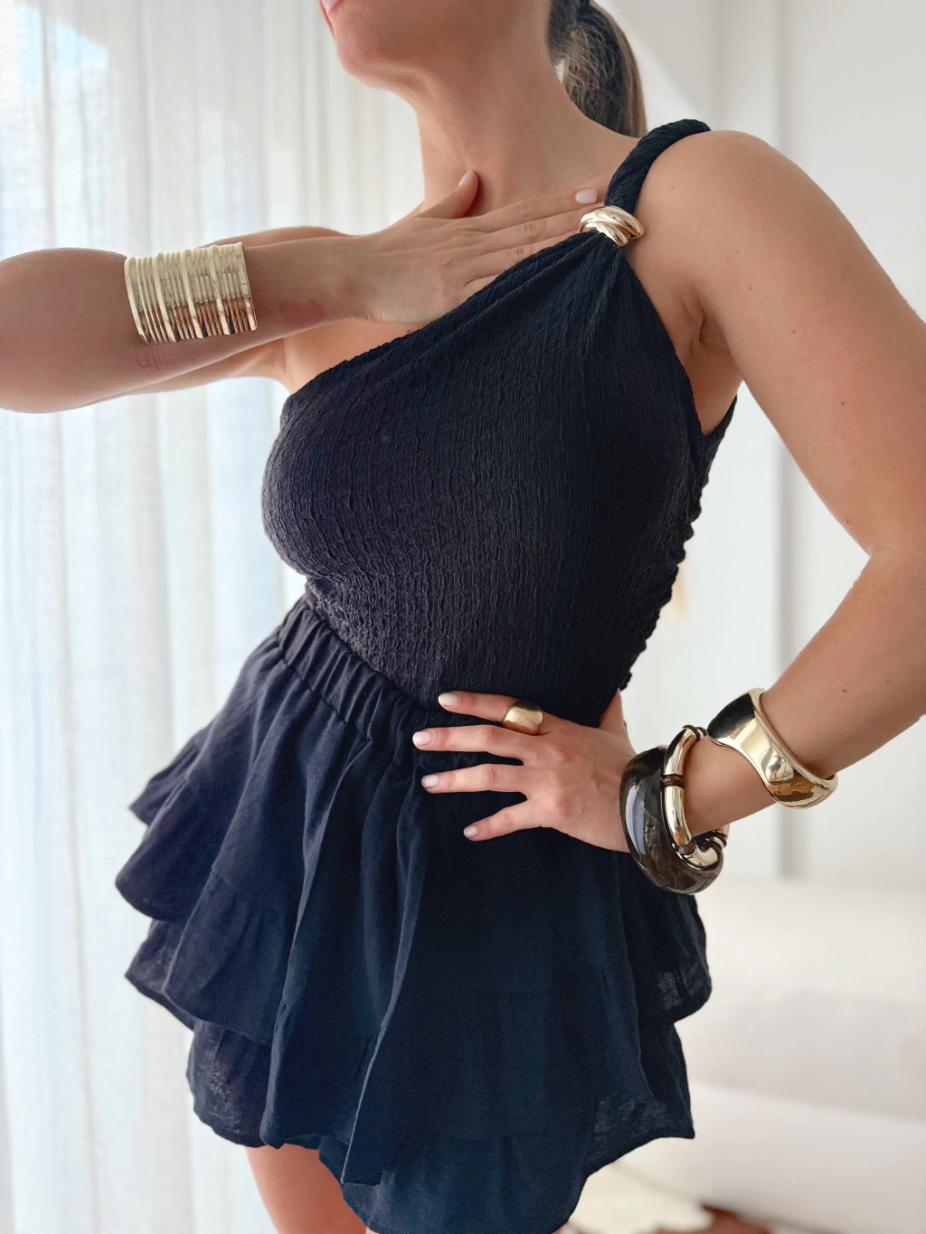 Mini con volados confecciónada en símil lino excelente calidad , amplia elastizada , va hasta un talle cuarenta y tiene short abajo
