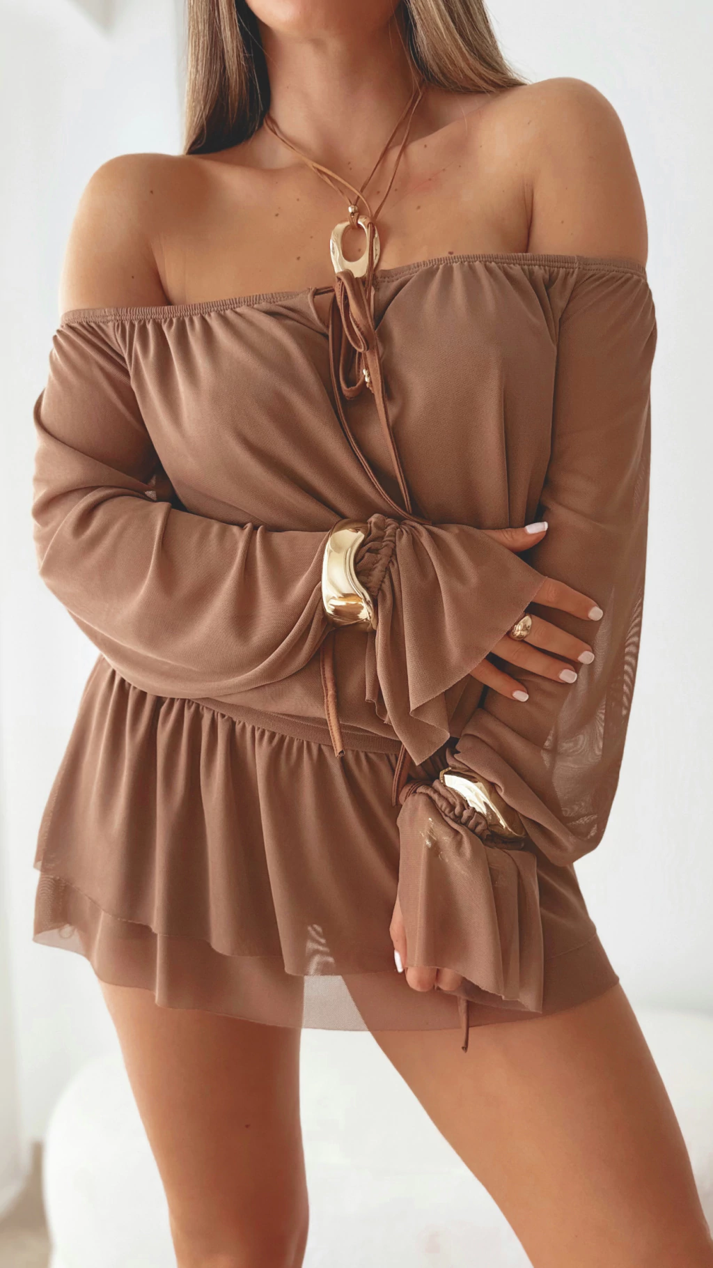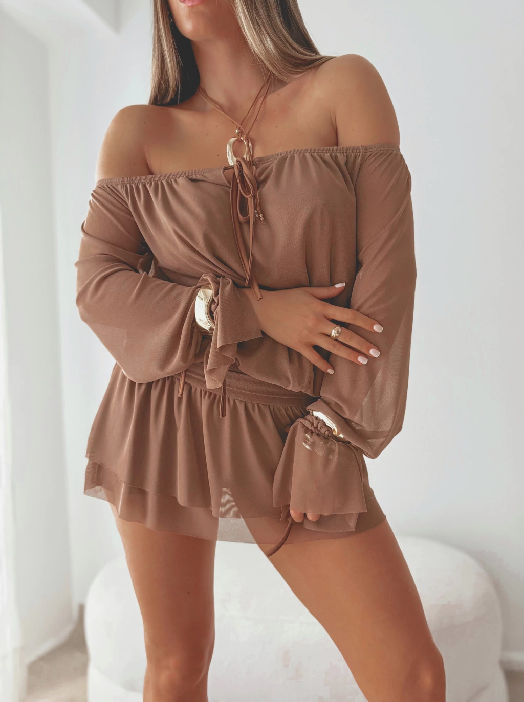 Vestido de microtul con faja en el abdomen hombros descubiertos y tira para atar en el cuello